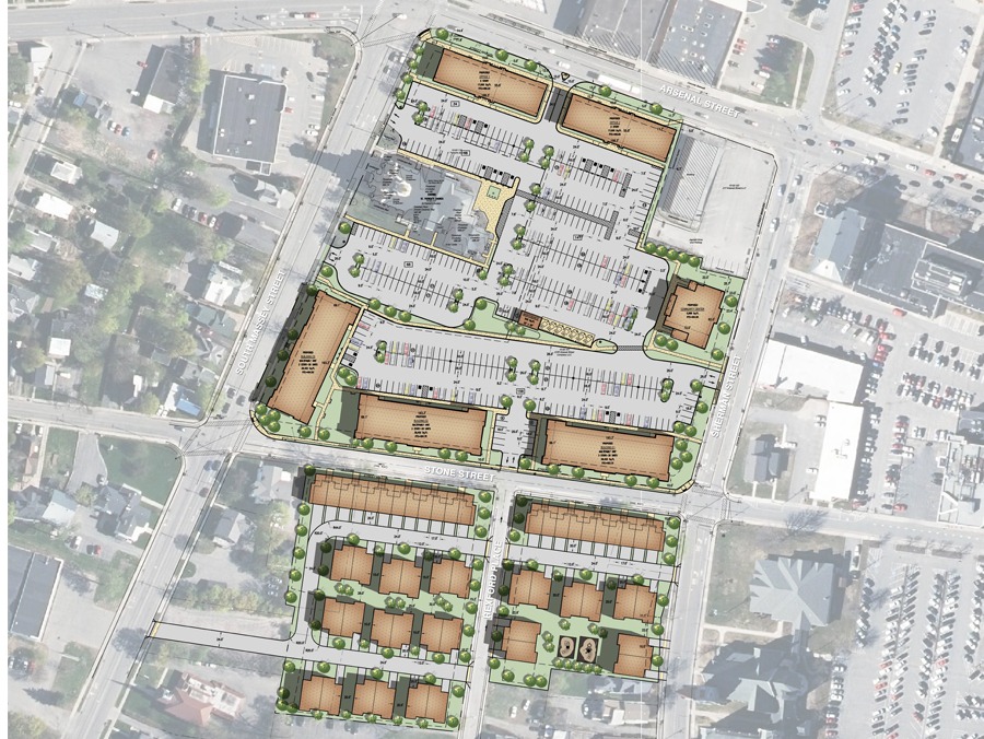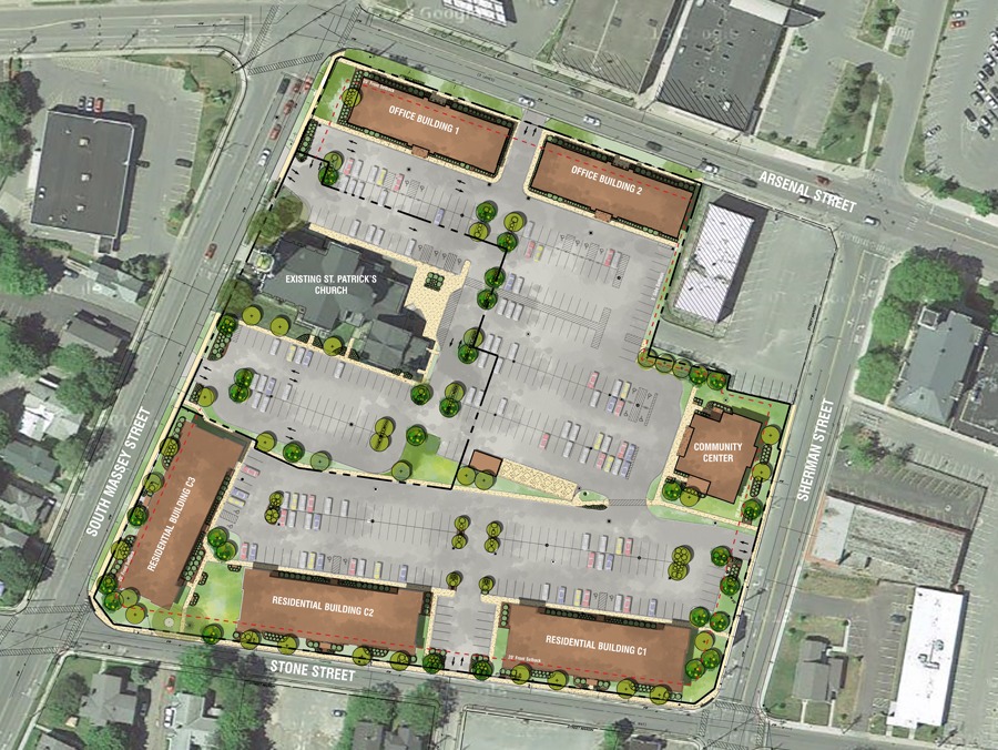 Mercy Heights is located at the intersection of Arsenal and South Massey streets, just east of the city center. The 7 Acre block has been approved for the first phase of development to include 34,000 SF of commercial space in (2) two-story buildings fronting Arsenal Street, 108 integrated market rate and affordable apartments alonf South Massey and Stone Streets and a 5,500 SF community building on Sherman Street for use by the residents and the existing St. Patrick’s Parish. On-site parking is located internal to the block to support all planned uses including the Church.